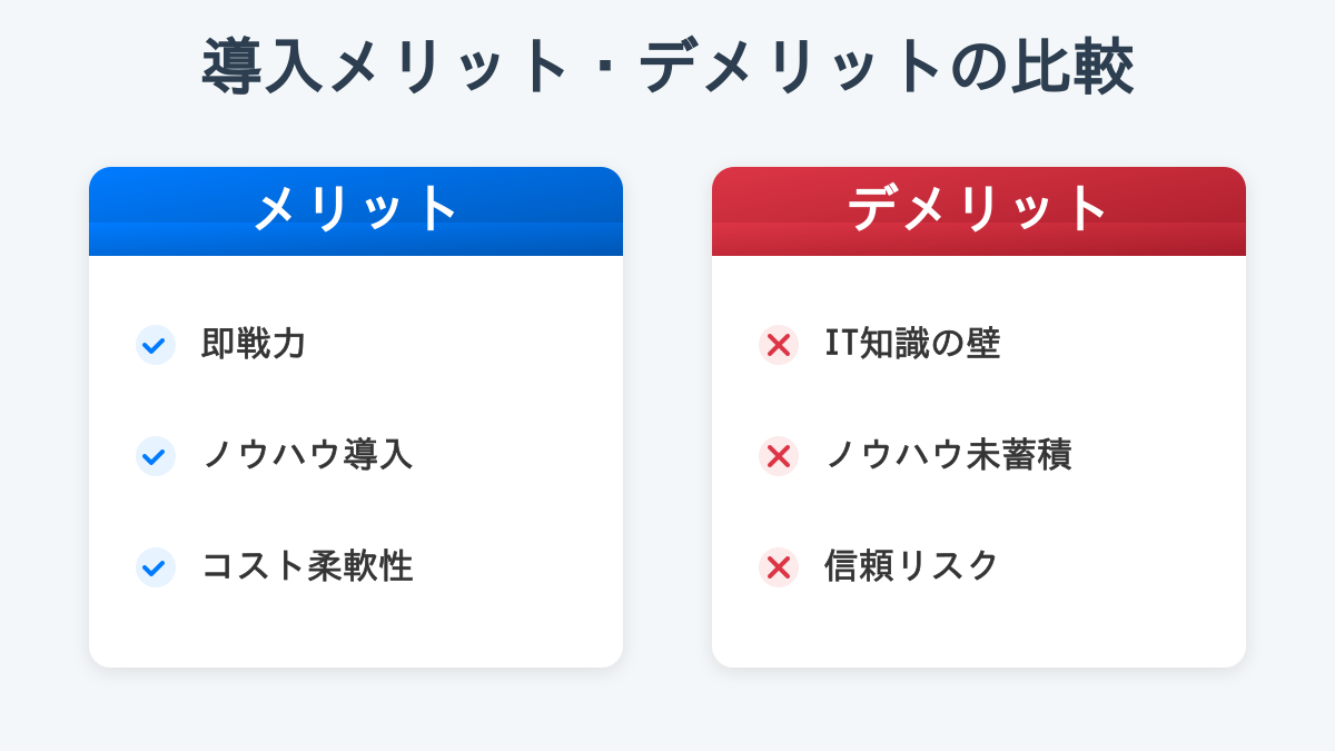 BtoB営業代行を検討する際、単に「人が増える」という視点だけでは不十分です。受託開発特有の商談サイクルを理解した上でのメリット・デメリットを整理しましょう。
