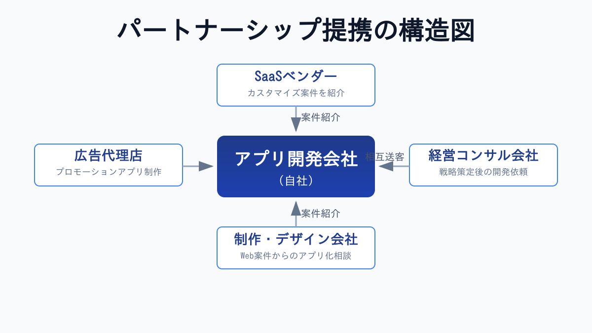自社だけで営業せず、補完関係にある他社と提携して案件を紹介してもらう仕組みです。