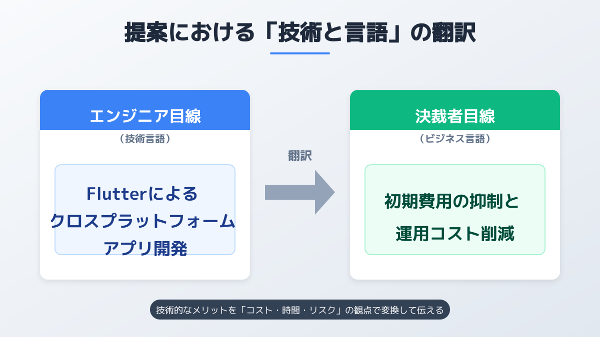 決裁者が知りたいのは、開発言語の優位性ではなく、事業へのインパクトです。