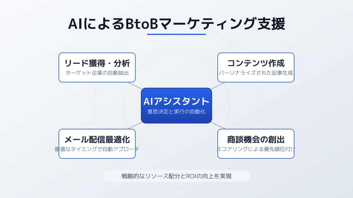 個別の課題に寄り添ったコンテンツ制作には多くのリソースが必要です。ここで強力な武器となるのが生成AIです。リードスコアリング、提案資料の自動生成、営業トークスクリプトの生成などにAIを組み込むことで、担当者は煩雑な作業から解放されます。