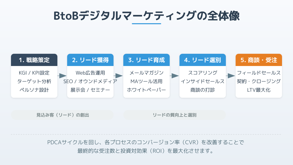2026年のBtoBマーケティングは、AIの本格活用と「量より質」への転換が成功の鍵を握ります。本記事で解説したBtoBデジタルマーケティングのポイントを再確認し、自社の戦略に落とし込みましょう。