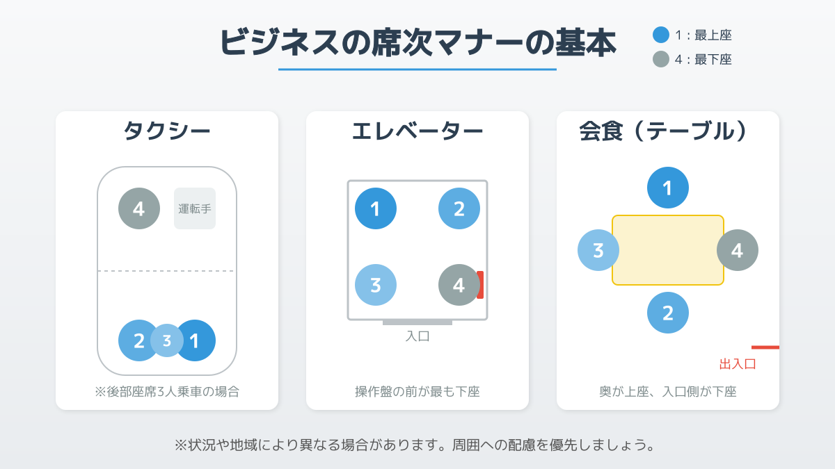 - 会議室や応接室だけでなく、移動時や会食時にも適切な席次を意識する