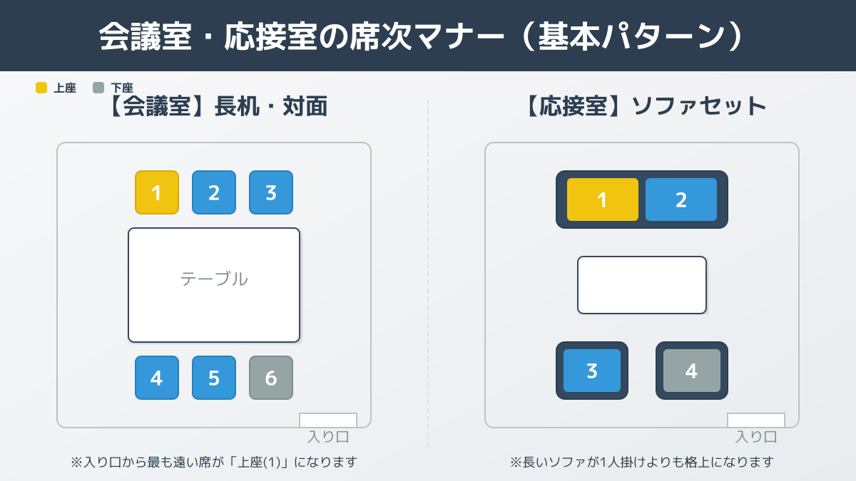 席次の基本的な判断基準として、 出入り口から最も遠い席が上座、最も近い席が下座 という大原則があります。この原則は、会議室や応接室だけでなく、出張などの移動時にも応用されます。