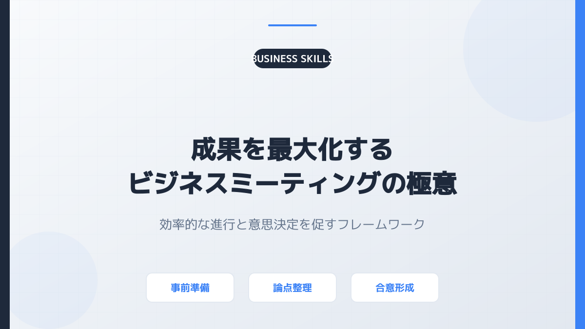 事前の準備から当日の提案、そしてクロージングへと至る商談の流れのなかで、最初の 着席 は第一印象を決める重要なポイントです。相手に不快感を与えない適切な席次への案内は、その後の対話をスムーズに進める潤滑油となります。提案内容を確実に届けるためにも、まずはマナーでつまずかないことが不可欠です。あわせて、提案自体の質を高めたい場合は、成約率が劇的に上がる「営業資料」の作り方と構成|オンライン商談で決裁者を動かすコツ も参考にしてください。