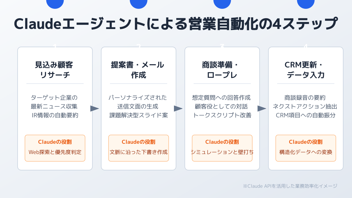 Claudeエージェントは、営業プロセスの各段階において、その能力を最大限に発揮します。ここでは、具体的な営業シーンにおけるClaudeの活用方法を詳細に解説します。