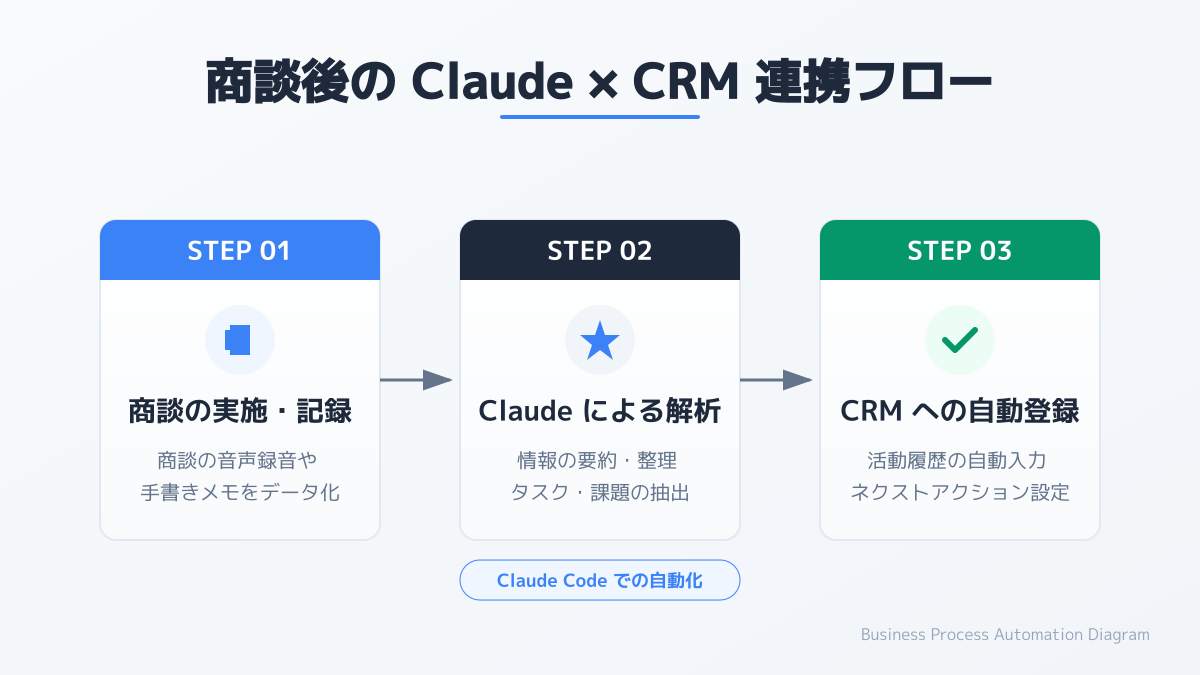- 商談後、Claude Codeが議事録を要約し、CRMに自動で入力。次アクションを自動でタスク登録。