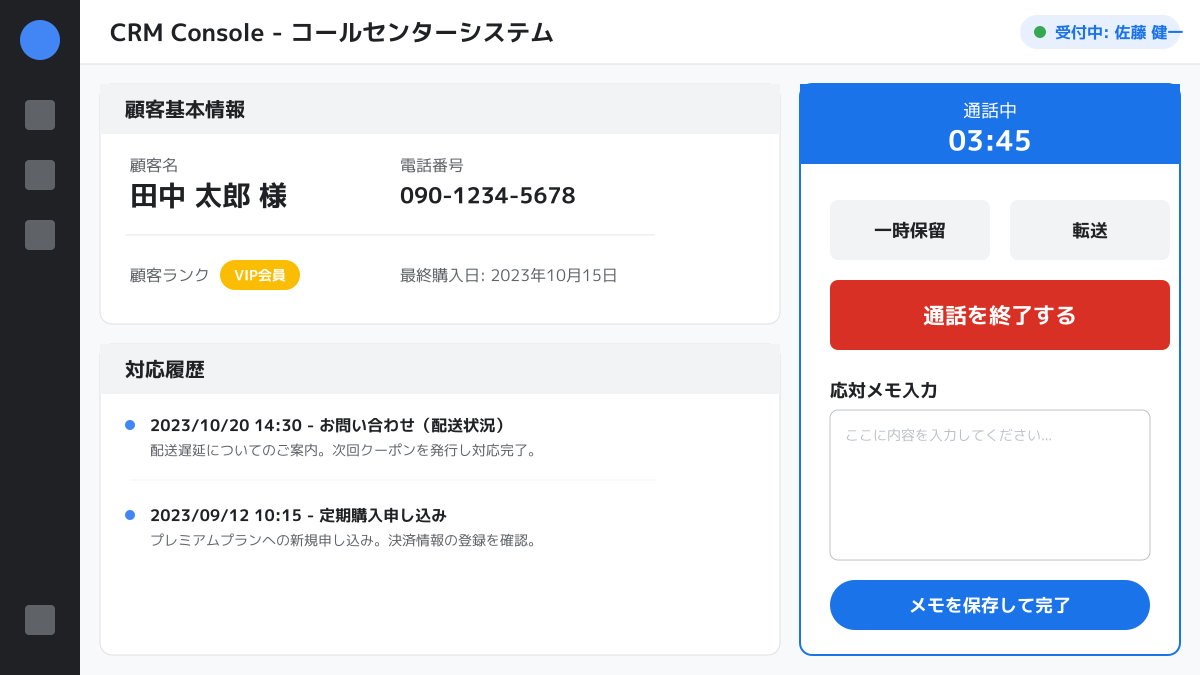 CRMシステムは、顧客とのあらゆる接点情報を一元管理し、長期的な関係性を構築するための基盤です。特にコールセンター業務においては、この情報管理が応対品質の要となります。