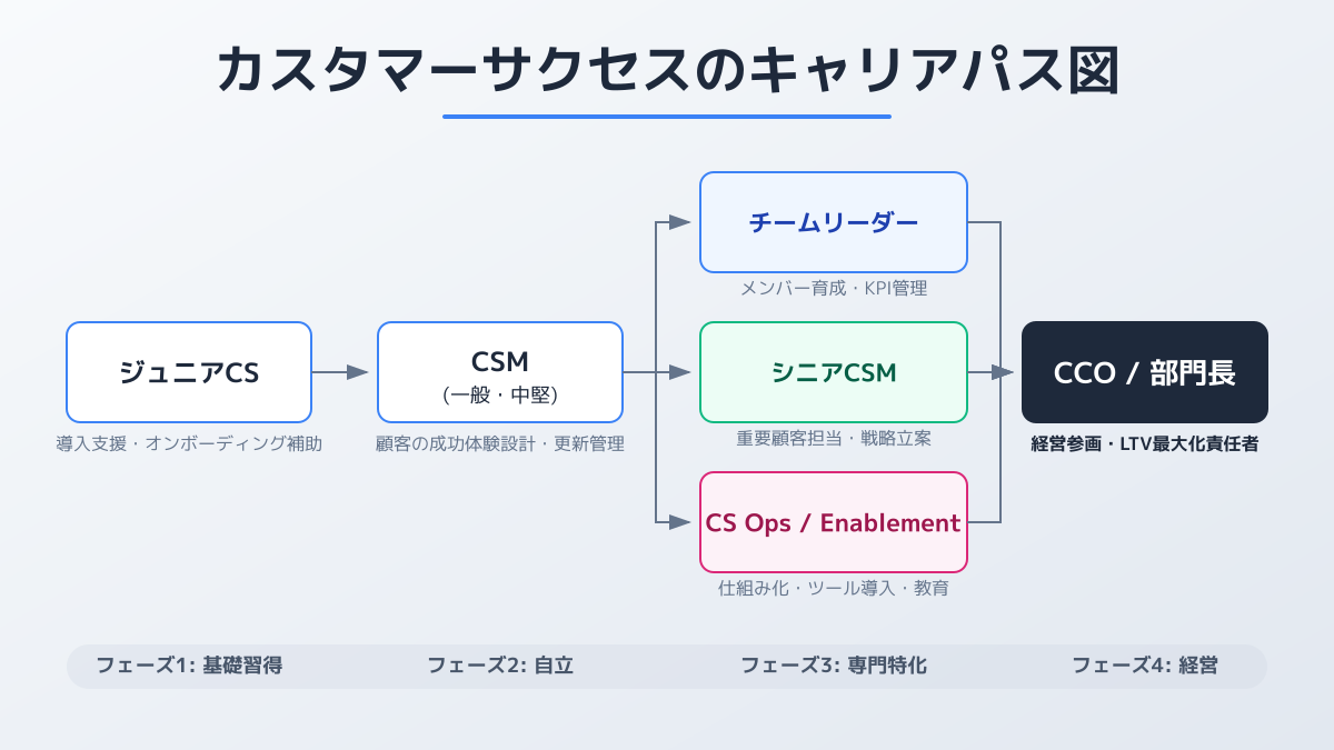 募集内容を検討する際、単なる顧客サポートの延長として扱われていないかを確認してください。優れた企業では、カスタマーサクセスからプロダクトマネージャー(PdM)への異動や、事業責任者への昇格など、多様なキャリアパスが用意されています。