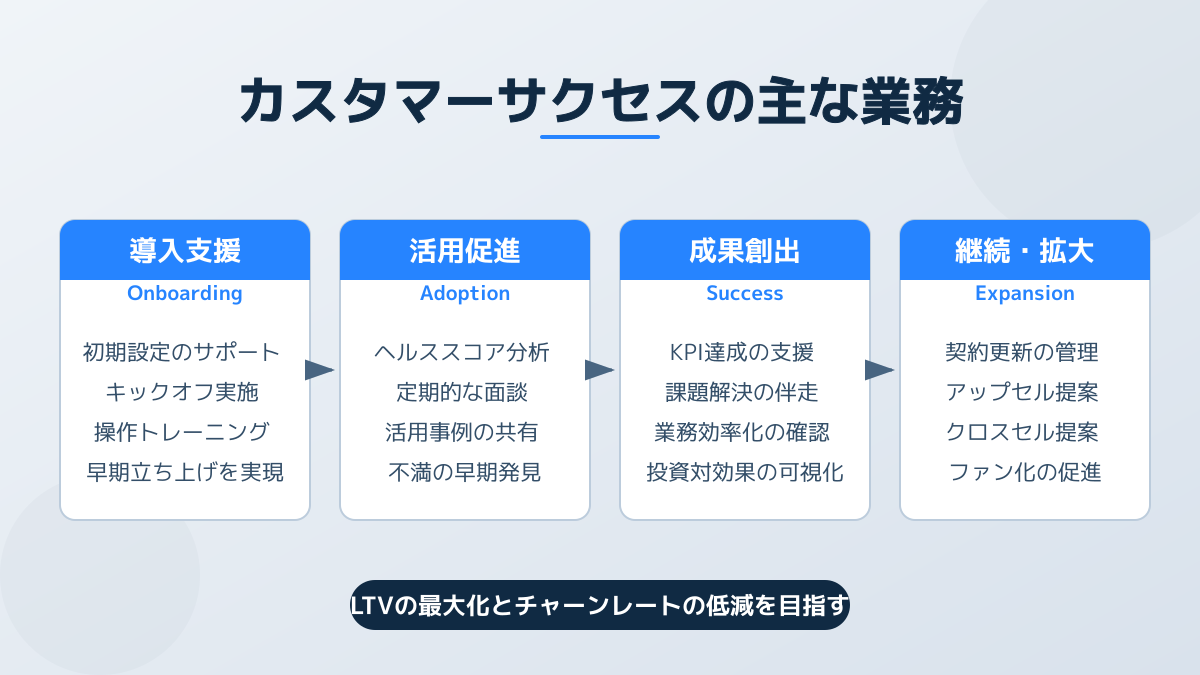 カスタマーサクセスの業務は、主に導入支援(オンボーディング)、活用促進、契約更新(リニューアル)、そして追加提案(アップセル・クロスセル)に分かれます。初期離脱を防ぐためのチャーンレート(解約率)低下を重視する企業もあれば、LTV(顧客生涯価値)の最大化をミッションとする企業もあります。