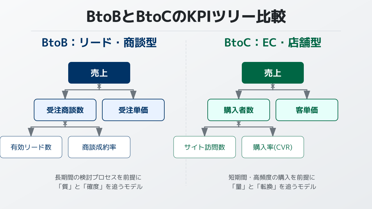 | 商材の例 | SaaSツール(MA・SFA)、オフィス機器、コンサルティングサービス | 日用品、アパレル、スマートフォン、飲食サービス |