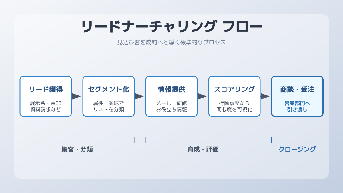 獲得した見込み顧客(リード)を育成し、購買意欲を高めていくリードナーチャリングは、BtoBマーケティングの要です。育成の前提となるリードを効率的に集める手段については、BtoB向けリード獲得ツールのおすすめ比較をご覧ください。