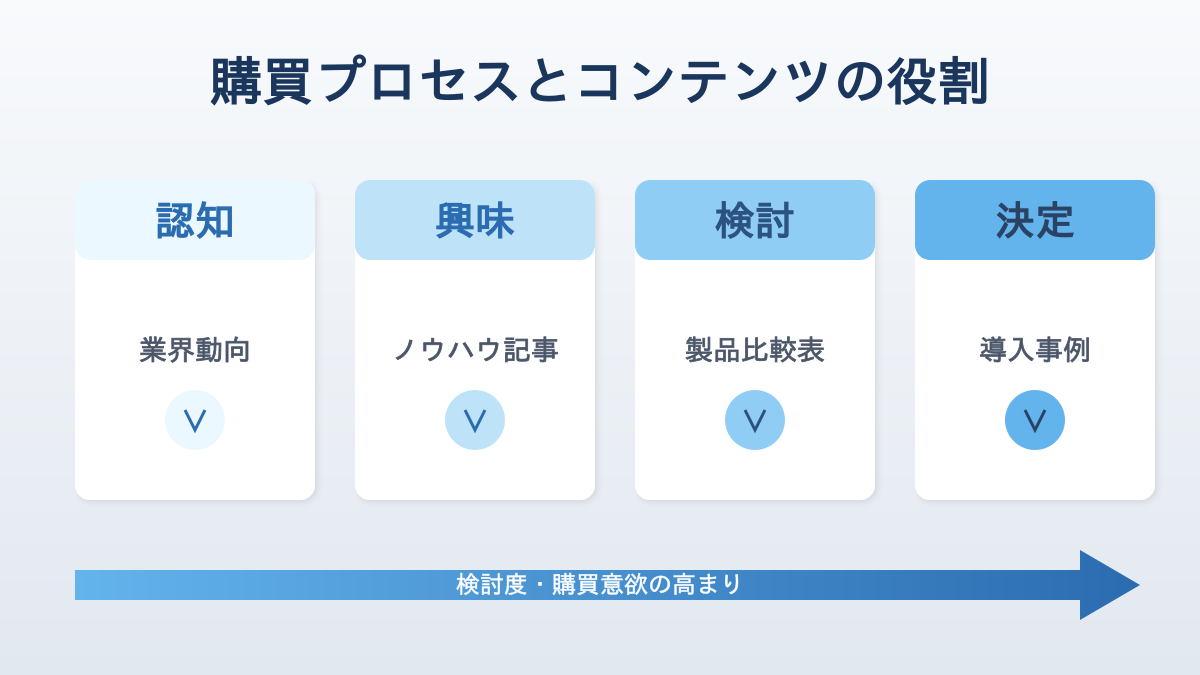 リードナーチャリングでは、顧客の検討フェーズ(認知・興味・検討・決定)に合わせて、提供するコンテンツを変えることが重要です。初期段階では「ノウハウ記事」や「業界動向」、検討が進んだ段階では「製品比較表」や「導入事例」といった具合に、段階的に情報を出し分けます。