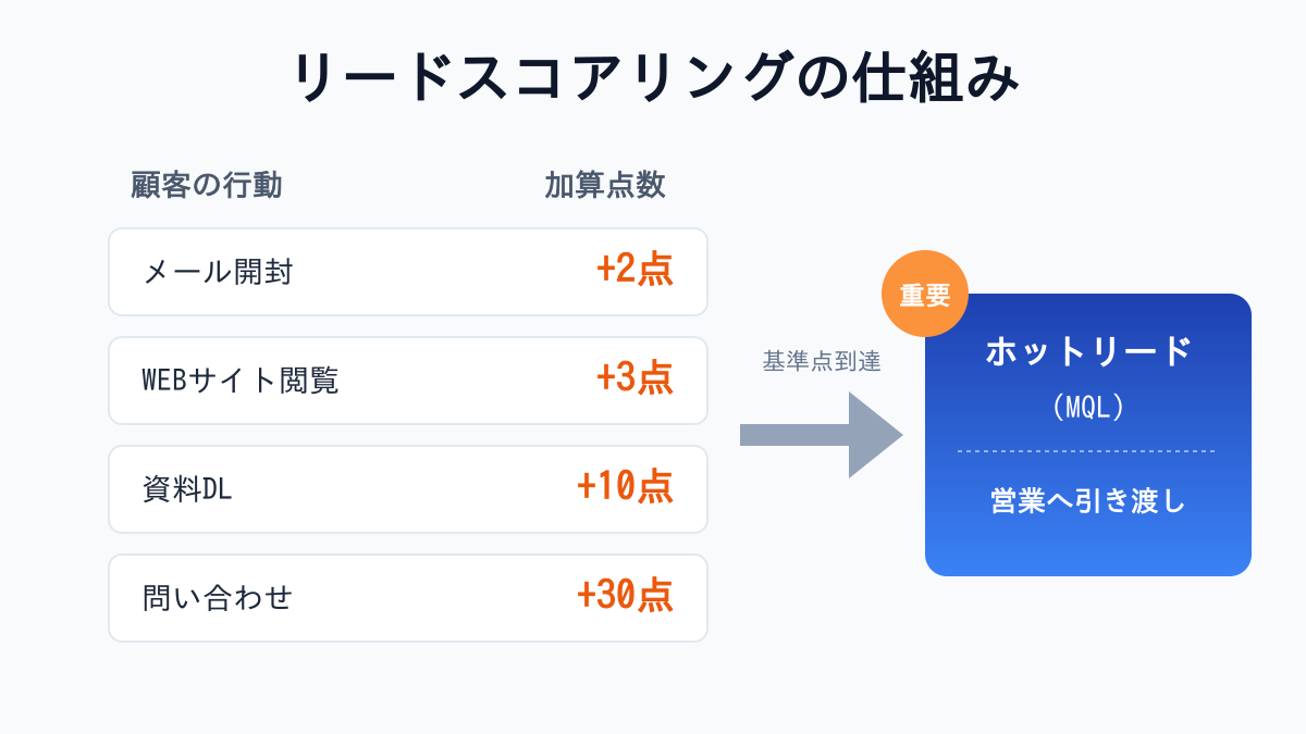 すべてのリードに電話をかけるのは非効率です。「メールを開封したら2点」「資料をダウンロードしたら10点」といった スコアリング(点数付け) を行い、一定の点数を超えた「ホットリード(MQL)」だけを営業へ引き渡す仕組みを構築します。