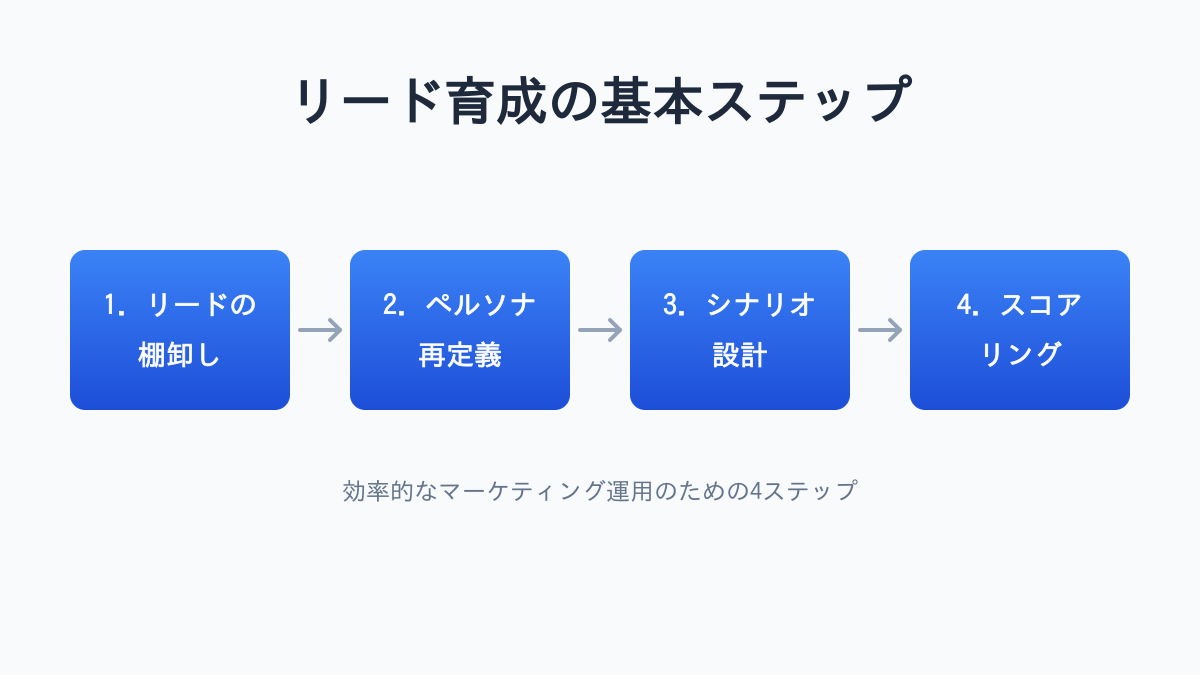 リードナーチャリングは、闇雲にメールを送れば良いわけではありません。以下の4ステップで戦略的に進める必要があります。
