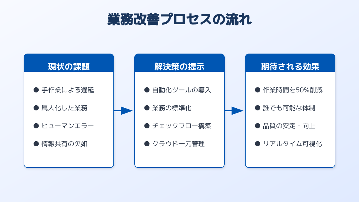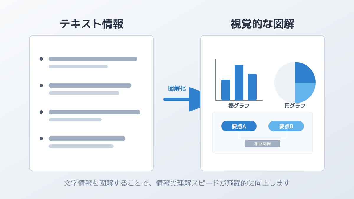 文章で詳細を説明しようとするのではなく、図解やグラフ、アイコンなどを駆使して「見るだけで伝わる」状態を目指す必要があります。単純な箇条書きで済ませるのではなく、手順を示す「プロセス図」や、競合優位性を示す「比較表」などに変換し、直感的な理解を促しましょう。