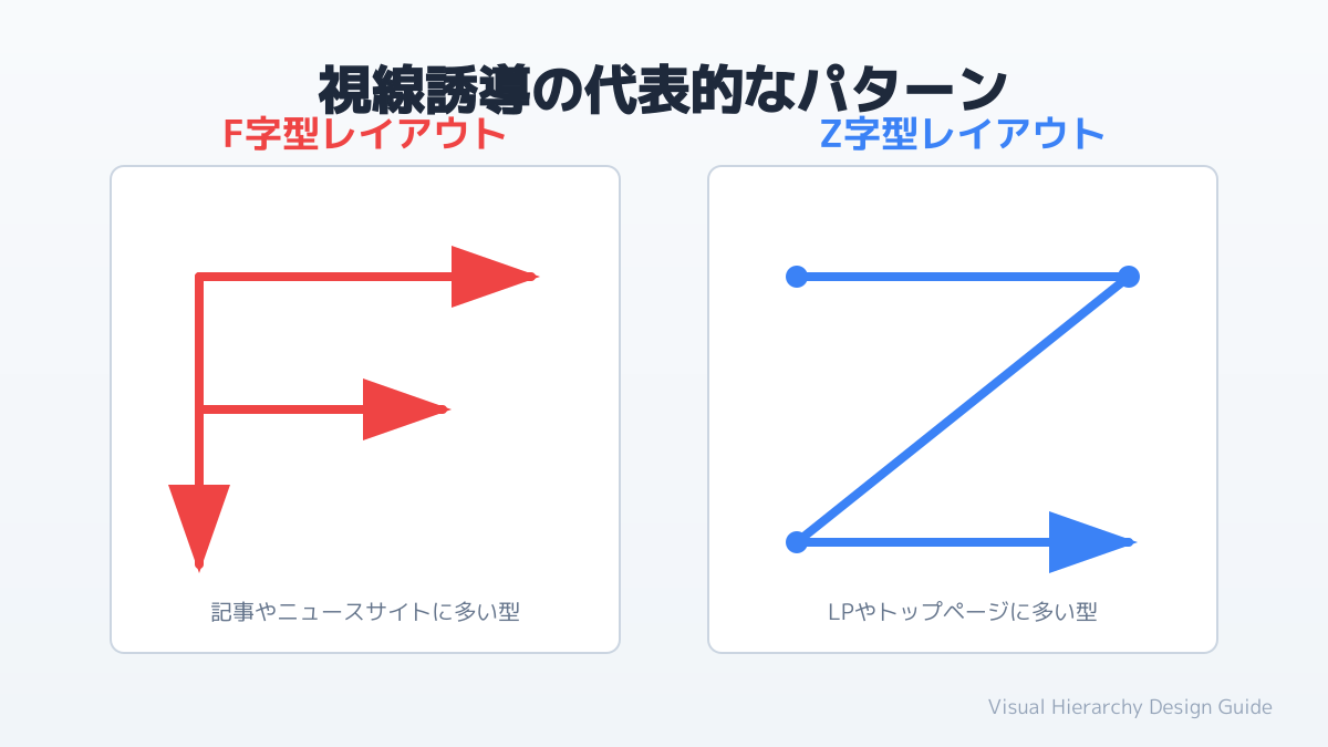 F字型に加えて、紙媒体やスライド資料でよく用いられるのが「Z字型」の視線誘導です。左上から右上、そして左下から右下へと視線が移動する特性を活かし、ストーリーの起承転結を配置します。