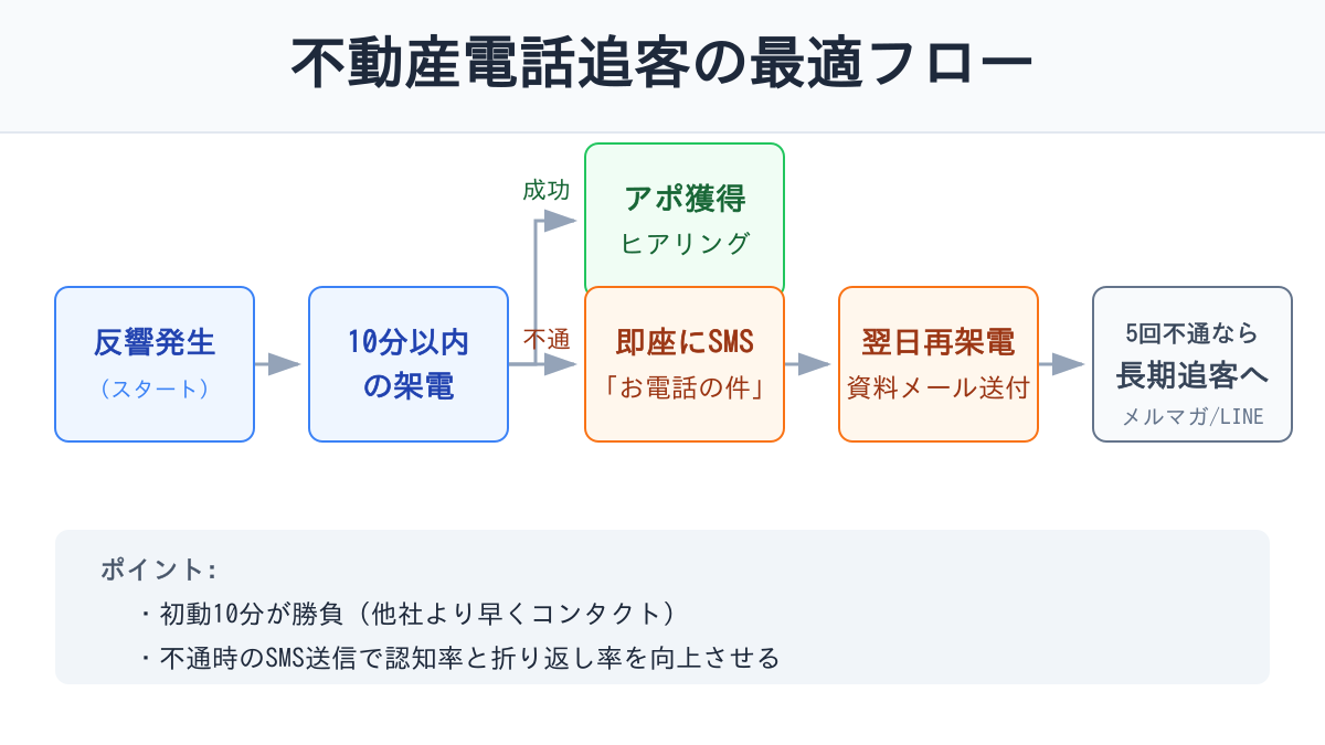 特に重要なのが、電話単体で完結させず、メールやLINE、SMSを組み合わせた 「マルチチャネル追客フロー」 です。
