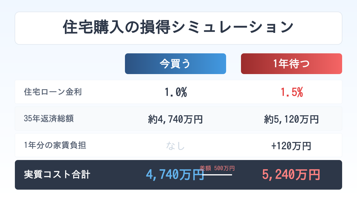 多くの場合、1年待つことで支払う家賃や、金利上昇による借入額の減少を考慮すると、「今買うメリット」が明確になります。