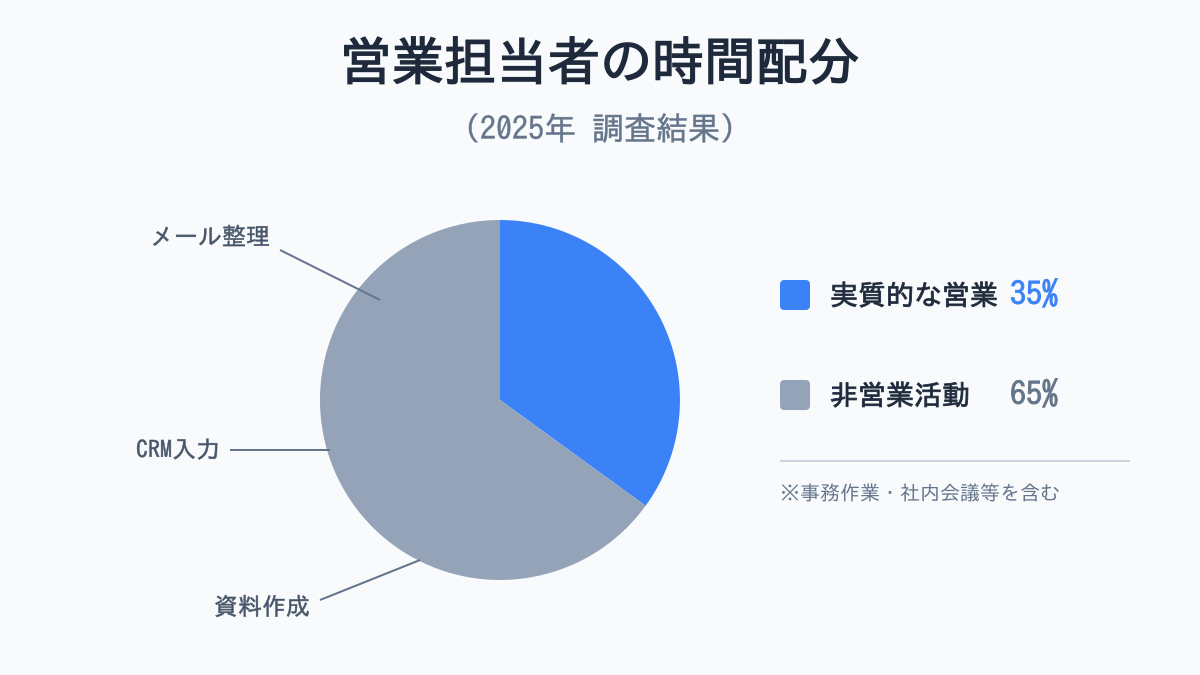 2025年の最新調査によると、営業担当者が実質的な営業活動に費やせている時間は、全体のわずか 35% に留まっています。残りの 65% は、顧客情報の入力や資料作成、社内報告といった事務作業に消えています。フォローの重要性は理解していても、物理的に時間が足りないのが現場の本音です。
