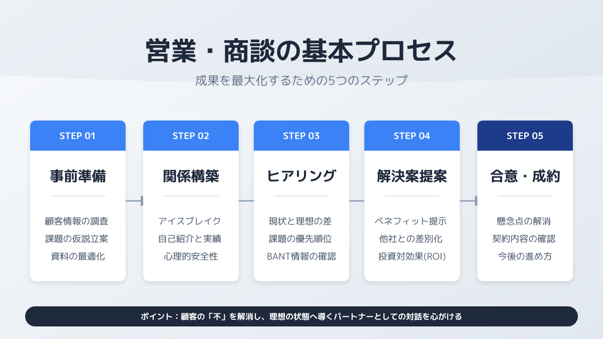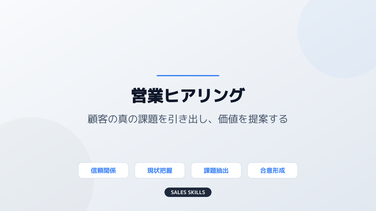 相手を問い詰めない空気づくりが不可欠です。尋問のように聞こえてしまうと、顧客は本音を隠してしまいます。「一緒に課題を整理する」という姿勢で問いかけてください。懸念点をヒアリングした後に検討が長引き、顧客からの連絡が途絶えてしまった場合は、資料送付後の「反応なし」を劇的に変える!後追い営業のトークスクリプトと最適なタイミング を参考に、適切なタイミングでアプローチを再開しましょう。