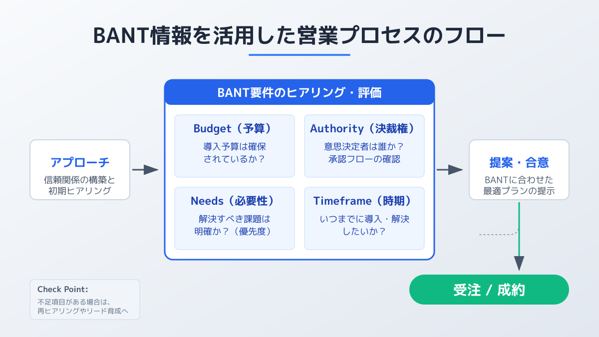 これらの要点を押さえることで、営業現場におけるヒアリングの精度が飛躍的に向上し、BANT情報の質が高まります。
