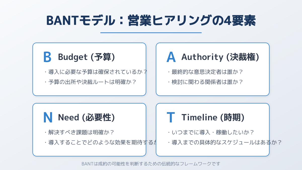 営業活動において、顧客の潜在的なニーズや導入意欲を見極め、商談を効率的に進めることは常に課題です。この課題を解決し、成約率を飛躍的に高める鍵となるのが、BANT情報に基づいたヒアリングです。BANTとは、Budget(予算)、Authority(決裁権)、Needs(必要性)、Timeframe(導入時期)の頭文字を取ったフレームワークであり、顧客から確実に情報を引き出すための強力なツールとなります。本記事では、BANTフレームワークを最大限に活用し、営業ヒアリングの質を向上させるための7つの具体的なポイントを解説します。顧客の真の状況を把握し、効果的なBANT営業プロセスを構築するための実践的な知識が得られるでしょう。