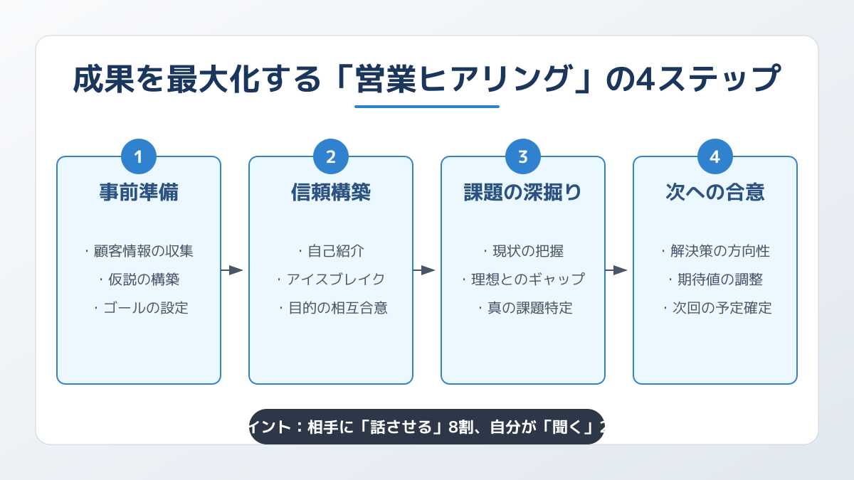 営業現場で効果的に活用するための6つ目のポイントは、ヒアリングの順序とタイミングを見極めることです。顧客との信頼関係が構築できていない初期段階で、予算や決裁権といったデリケートな質問を唐突に投げかけると、警戒心を抱かれるリスクがあります。