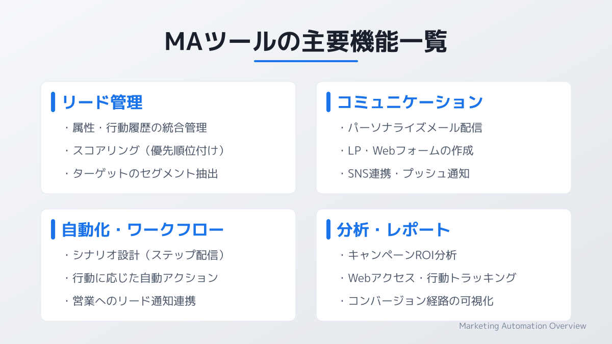 MAツールでできることは多岐にわたりますが、最大の強みは顧客一人ひとりに合わせたコミュニケーションの自動化です。具体的には以下の3つの機能が中核となります。