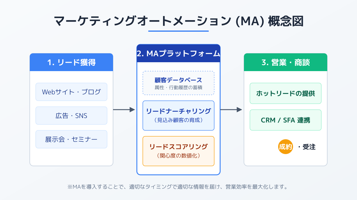 MAツールとは、マーケティング活動を自動化し、見込み顧客の育成や選別を効率化するシステムです。顧客の行動履歴を追跡し、適切なタイミングで最適な情報を届けることで、営業部門に確度の高い見込み顧客を引き渡す役割を担います。