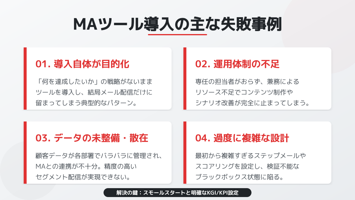 また、高度な設定の難しさが壁となり、多くの企業で運用を諦める典型的な失敗パターンも指摘されています。十分な戦略やコンテンツ作成体制がないまま多機能なツールを導入すると、設定画面の前で立ち止まってしまい、結果的に「単なる高額なメール配信ツール」としてしか使われないケースが多発しています。