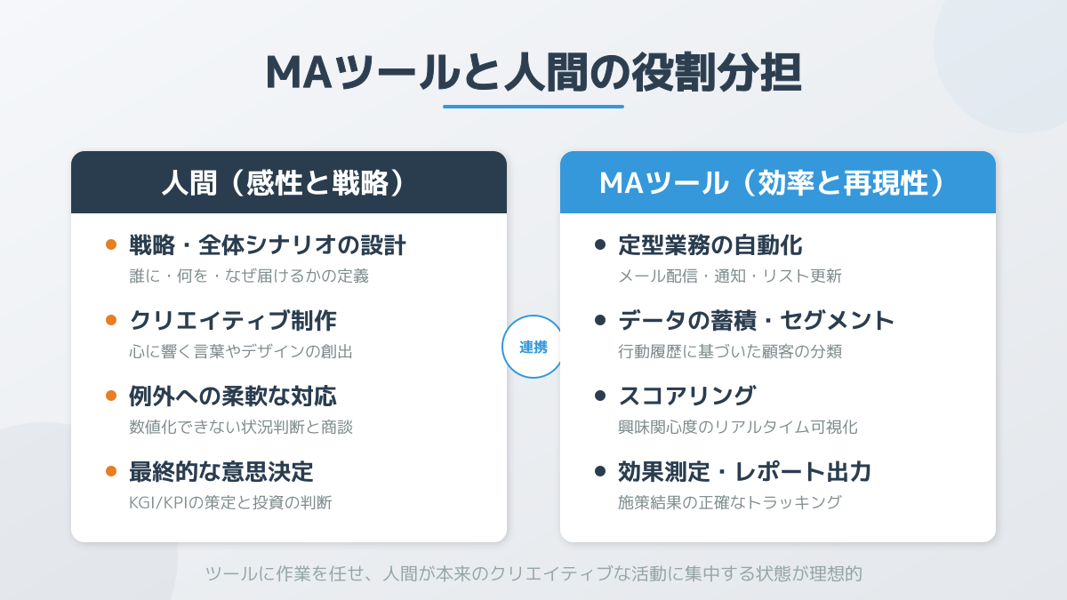 これまで手作業で行っていたメール配信や顧客データの分析をシステムに任せることで、担当者は戦略立案やコンテンツ制作といったクリエイティブな業務に集中できるようになります。しかし、ツールが担う「作業の自動化」と、人間が担う「戦略の構築」は完全に別物です。この境界線を正しく理解することが、導入を成功させる第一歩となります。